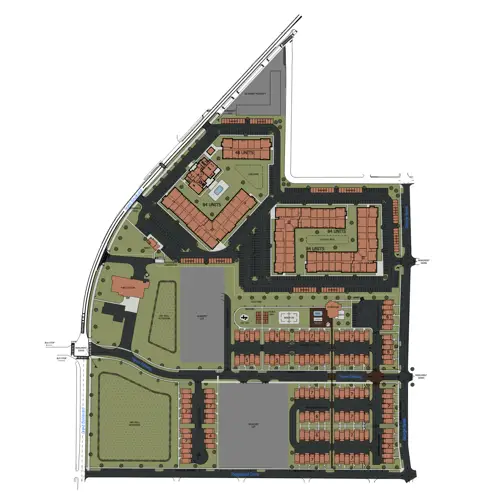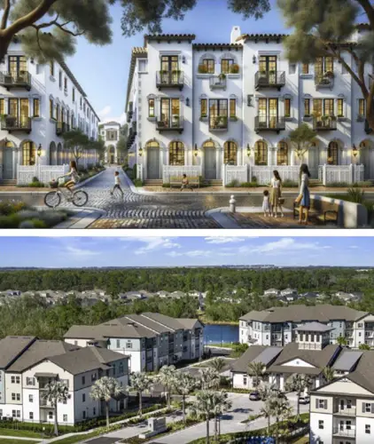 According to the current plan, the south side of the development would consist of single-family attached townhomes built in a Mediterranean style with balconies and arched doorways.